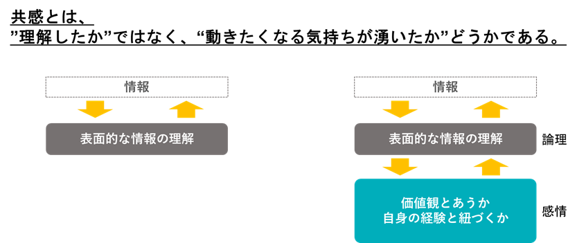 たとえば、「我々の部門は業務を効率化して全社を支える」と言われても、「まあそうだよね」と理解はできても、感情が動かなければ共感とは言えません。しかし、「私たちの働きが現場の仲間の笑顔や時間につながる」と語られたら、自分の価値観とつながり、「それならやってみたい」と思う人が増えるかもしれません。